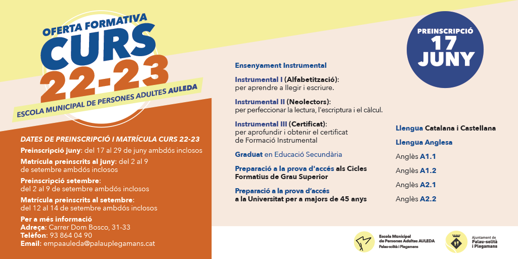L’Escola Municipal de Persones Adultes (Auleda) obre aquest mes de juny la preinscripció i matrícula per al curs 2022-23. Les dates per formalitzar la preinscripció durant el mes de juny seran del 17 de juny al 29 de juny, ambdós inclosos; i la matrícula pels preinscrits es realitzarà del 2 al 9 de setembre, ambdós inclosos. Les dates per realitzar la preinscripció al setembre seran del 2 al 9 de setembre, ambdós inclosos; i del 12 al 14 de setembre, ambdós inclosos.