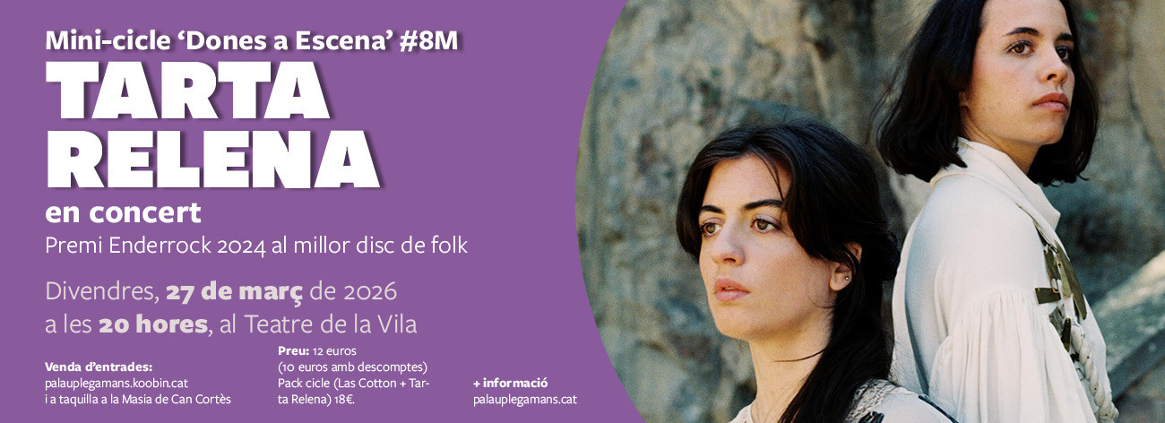 Tarta Relena arriba en concert per presentar el seu aclamat disc “És pregunta” (premi Enderrock 2024 a millor disc de folk). Un treball que ha consolidat el duet com una de les propostes més singulars i captivadores de l’escena actual. Es tracta del grup català amb més projecció internacional de l’escena catalana amb gires per America del Nord i Amèrica central i per la resta d’Europa. Guardonades amb diversos premis entre els que destaquen el Premio Nacional de Cultura 2025 del Ministerio de Cultura i dos premis Ciutat de Barcelona han estat reconegudes per la seva capacitat d’innovar a partir de la tradició vocal mediterrània. El grup ha seduït públic i festivals d’arreu amb una posada en escena hipnòtica i delicada que podrem gaudir al Teatre de la Vila.