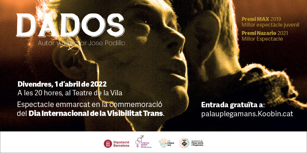 Palau-solità i Plegamans commemorarà el Dia Internacional per la a visibilitat trans* -que se celebra el 31 de març- amb la representació de l’obra teatral Dados. Aquest espectacle tindrà lloc el divendres 1 d’abril a les 20 hores al Teatre de la Vila, i hi haurà un col·loqui post-funció. L’entrada serà gratuïta, i segellable al Passaport Cultural i també es farà un passi el mateix dia al matí amb alumnat dels centres educatius del municipi. Aquesta és una proposta d’activitat treballada conjuntament entre les àrees de Cultura i Igualtat del consistori.
