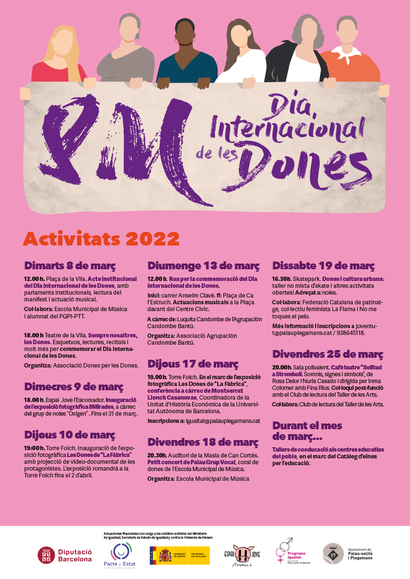 El proper 8 de Març es commemora el Dia Internacional de les Dones. Un any més l’Ajuntament de Palau-solità i Plegamans es bolca amb aquesta data programant diverses activitats durant tot el mes de març.